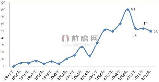圖表1:1994-2012年我國(guó)外診斷行業(yè)專利申請(qǐng)量(單位:件)
